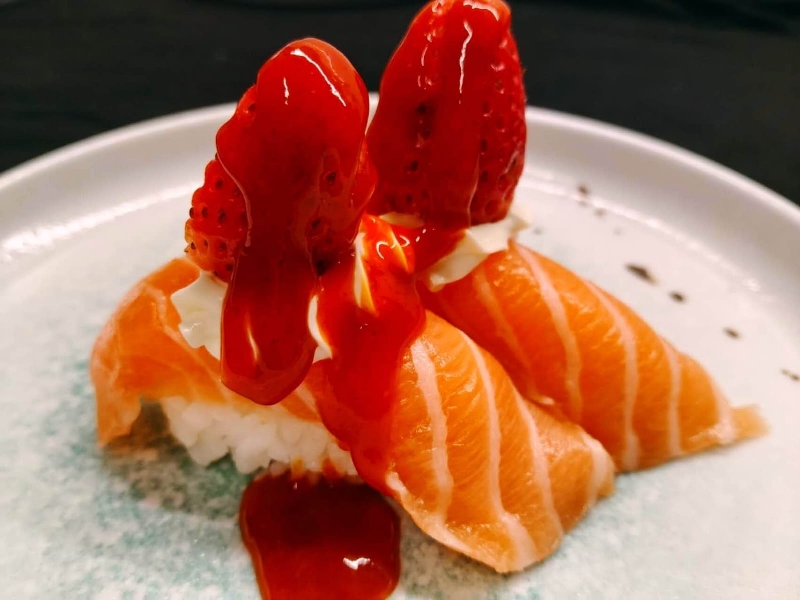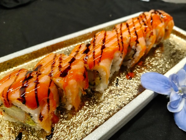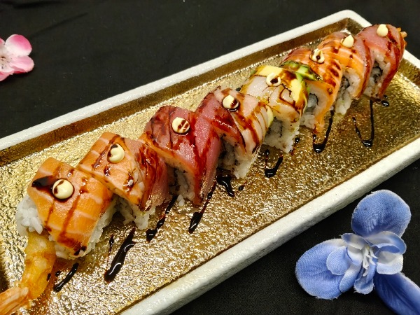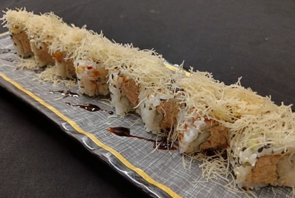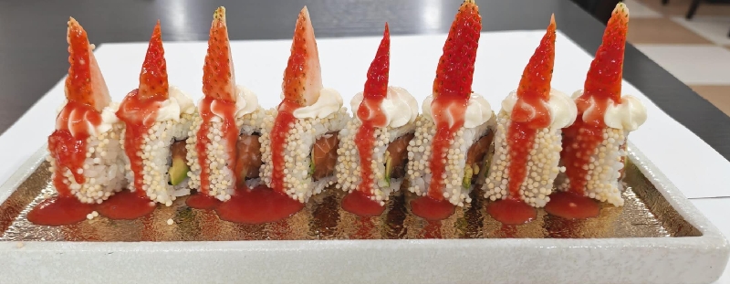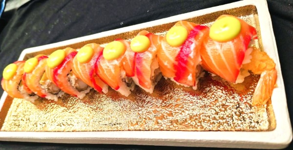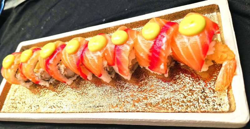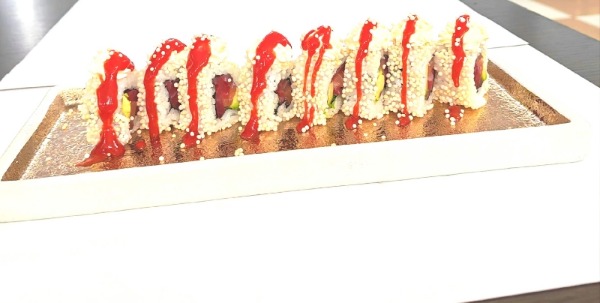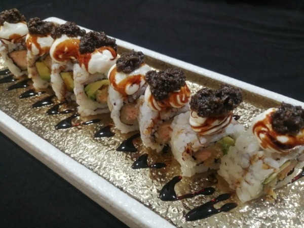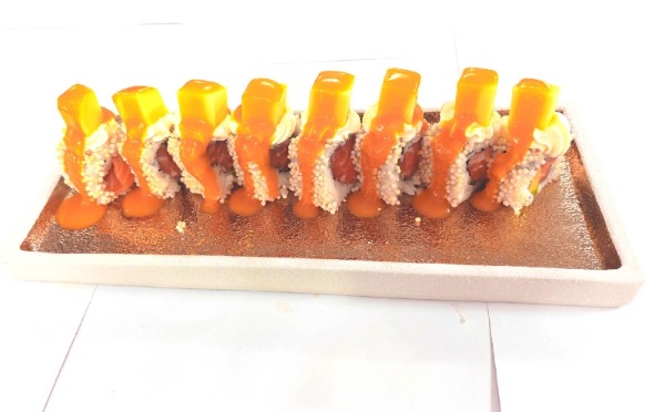 Gambero fritto, avocado, salmone, philadelphia, maionsese, tariyaki, mango, riso, alga