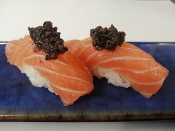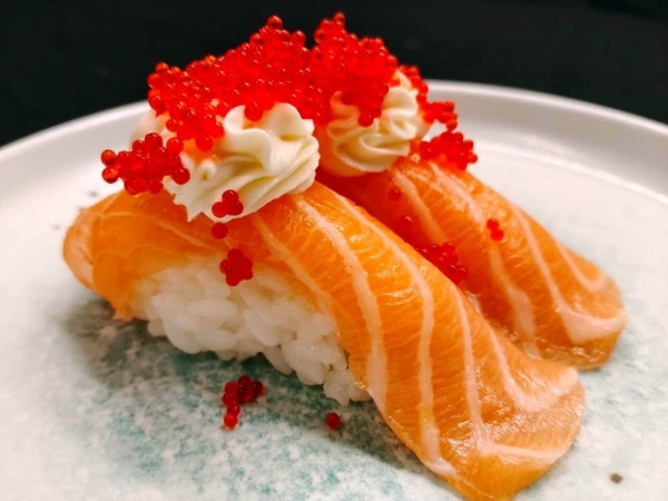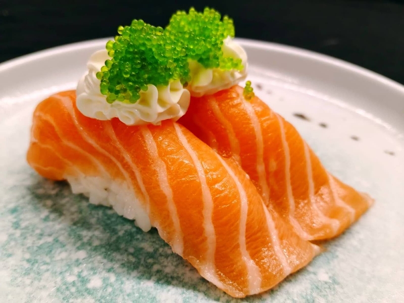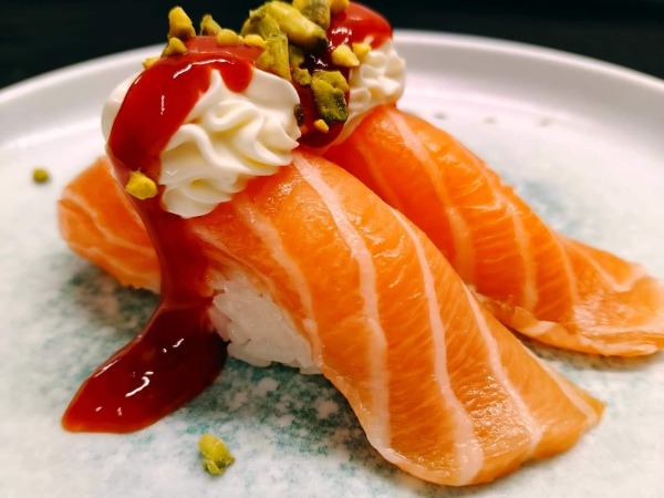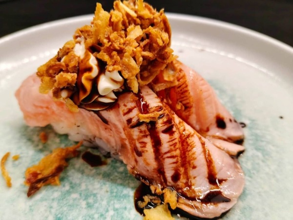 Salmone, avocado, philadelphia, salmone scottato, teriyaki, cipolla fritta, riso, alga