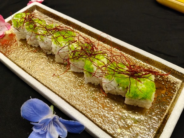 tempura gamberi. surimi. tobiko. gamberi cotti. phila. salsa thailandia. salsa avocado. riso. alga