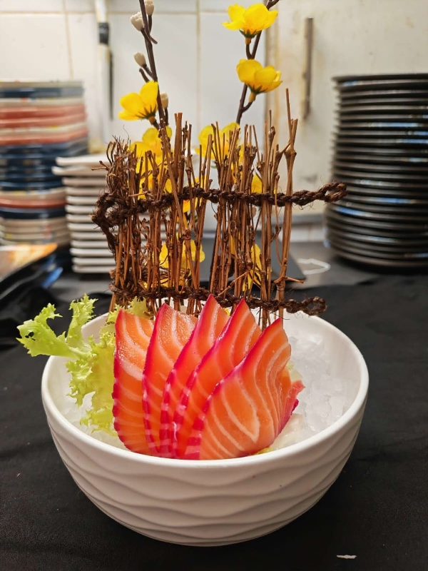 tempura gamberi. tartare Salmone. phila ceteriolo. salsa thailandia. teriyaki. riso. alga