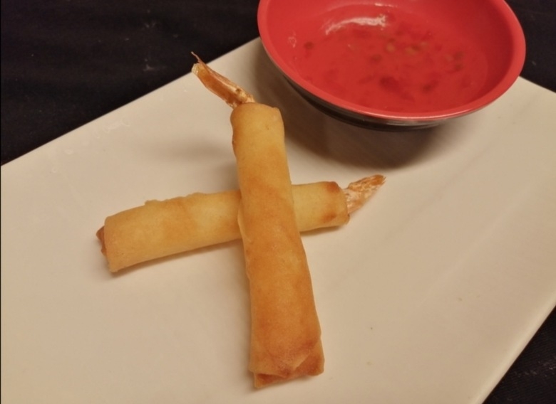 Gambero fritto avocado, philadelphia, salmone scottato, teriyaki, cipolla fritta, riso, alga