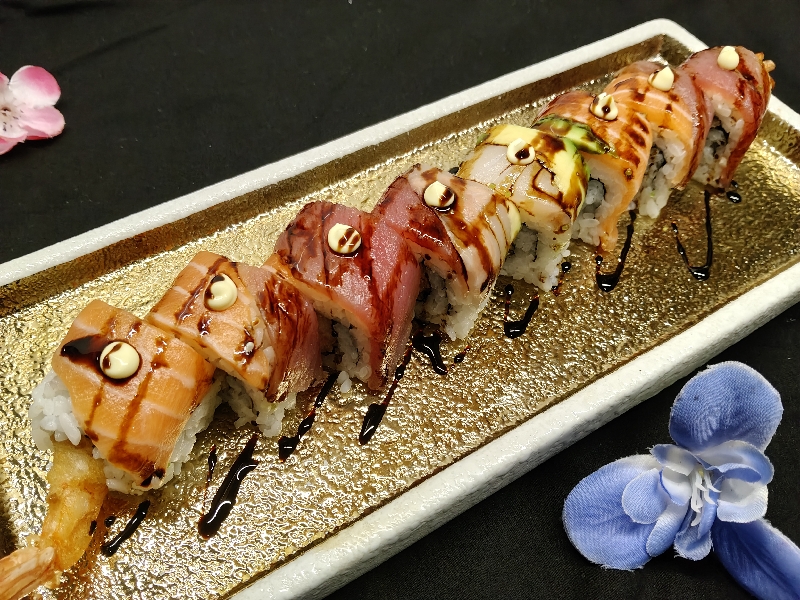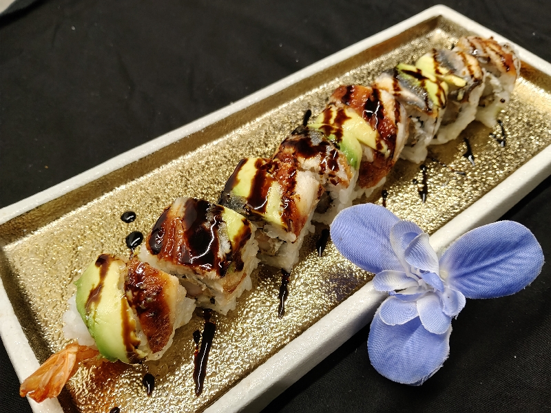 Gambero fritto, avocado, philadelphia, tonno esterno, teriyaki, riso, alga