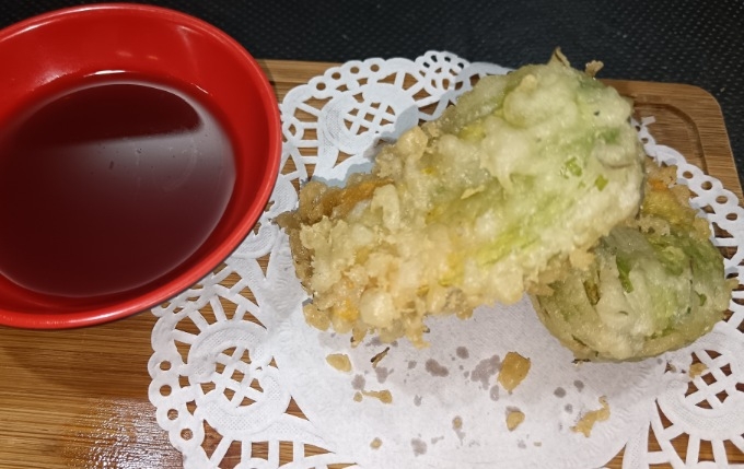 Tampura zucchine e carota, philadelphia, teriyaki, arachidi, salmone, riso, alga