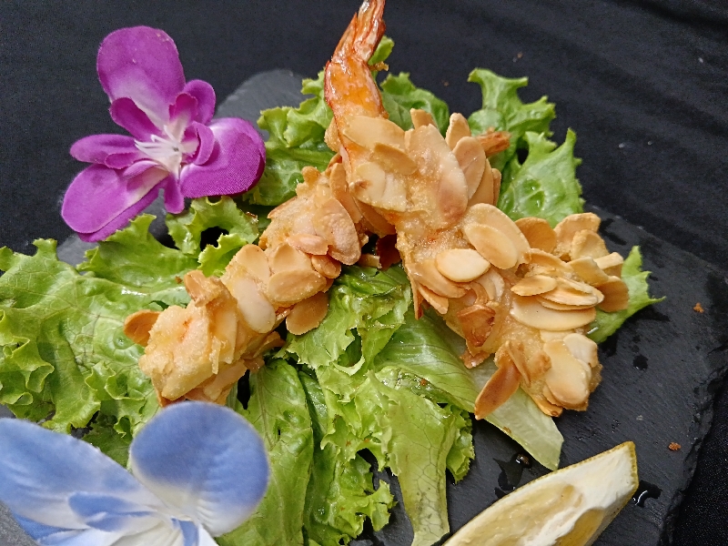 Gambero fritto, avocado, tartare di salmone, mandorle, teriyaki, riso, alga